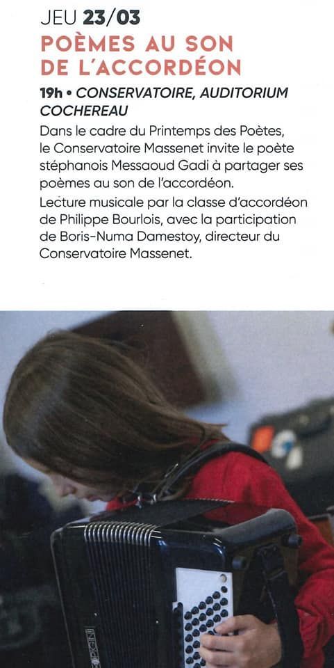 Je tiens a remercier monsieur Boris-Numa Damestoy directeur du Conservatoire Massenet de Saint-Etienne Métropole de son accueil et recitation de mes textes . Un grand bravo et merci aux jeunes éleves de la classe d'accordeon de Philippe Bourlois pour leurs talents. Leurs recitations et accords de musique sur mes textes resterons graves dans mon coeur. Je vous invite a applaudir leur professeur pour son engagement et coeur . Monsieur Emmanuel Mandon depute de la loire et Fabienne Durand depute-suppleante etaient presents . Un grand honneur pour tous , une reconnaissance republcaine pour mes textes et parcours de vie . Et un encouragement a tous ces jeunes talents . Je tiens a saluer la presence de Kader Nightss Un grand stephanois de coeur et talent .ainsi Que Gaëtan Rocher et Aurelia Da Ravenna Deux grands soutiens de coeur et d'avenir . Jean Pierre Kotchian conseiller Municipal Stéphanois a la culture partagea avec moi cet instant poétique